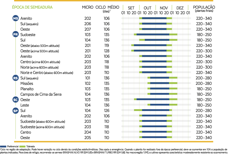 - Cultivar precoce que permite abertura de semeadura e plantio de 2ª safra nas regiões mais quentes