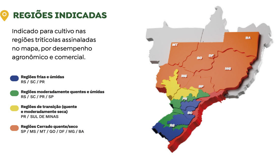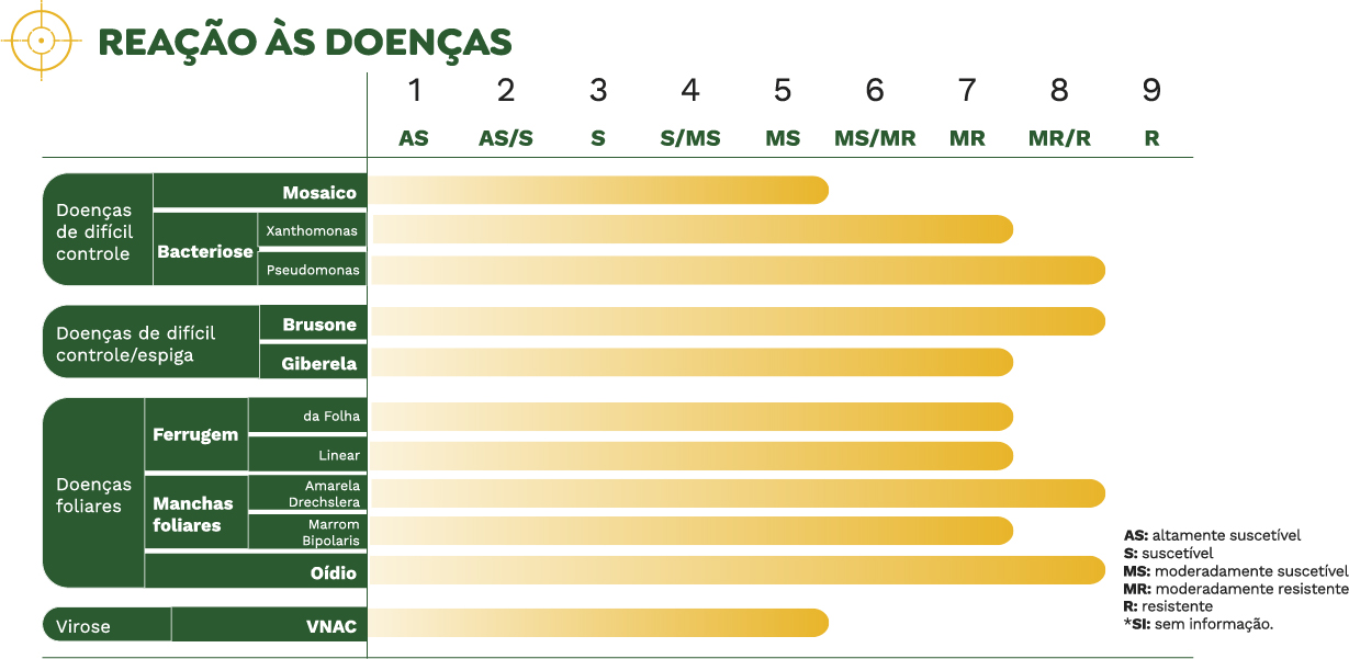 - Excelente pacote fitossanitário, com destaque para oídio, manchas foliares, giberela e brusone;
